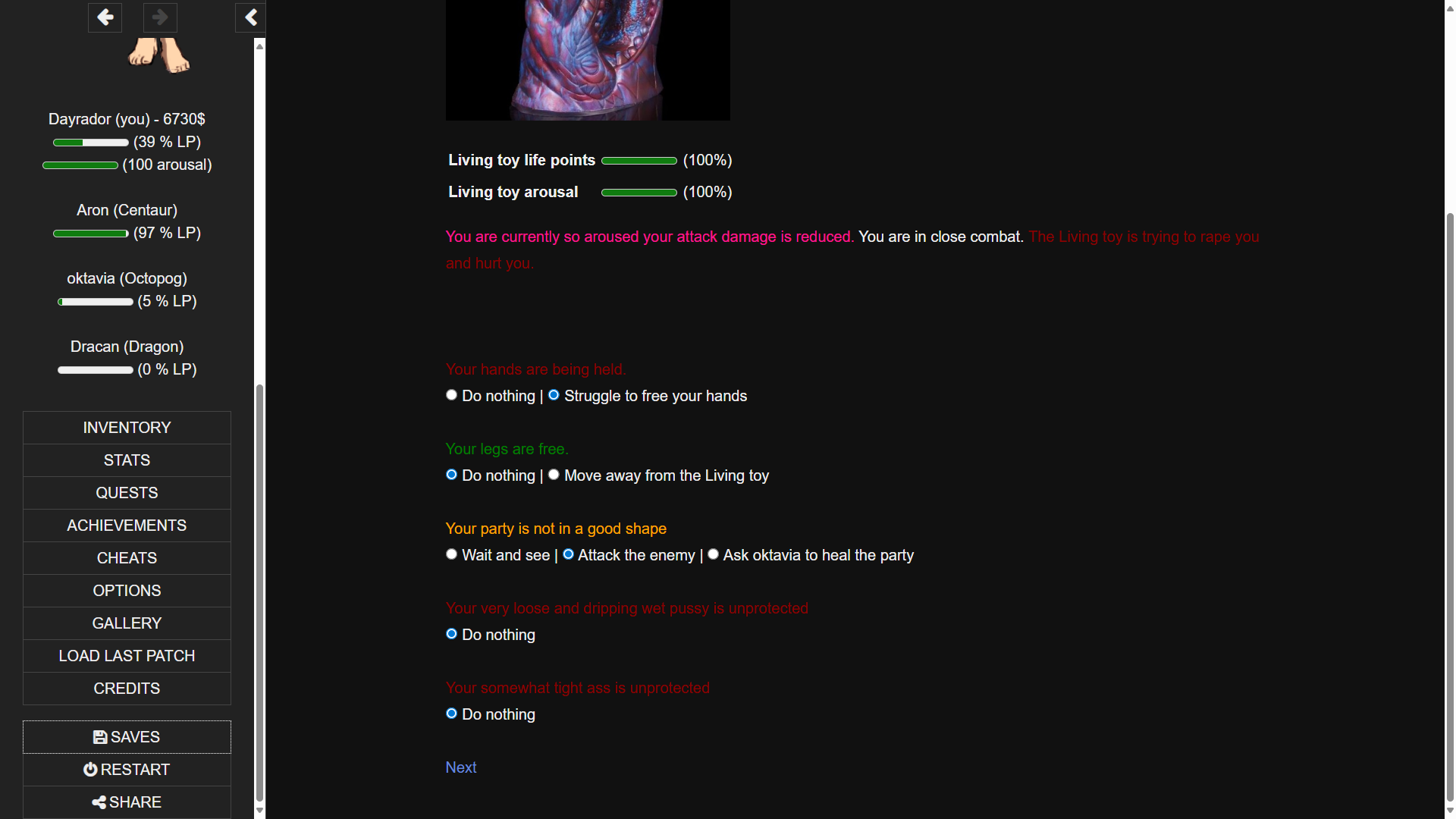And another thing—when you can visit your companions in their rooms, like the octopus girl, for example, you get two options: to leave or to interact with her. But for me, the 'interact with her' option appears in white, not in blue, like it's just part of the text and not an actual action I can choose